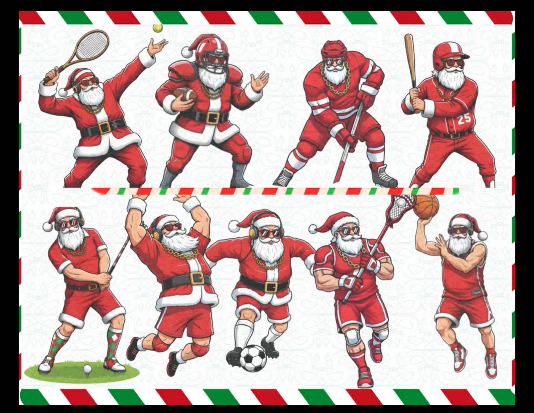 Get ready to score big on holiday spirit with this Santa Sports sweatshirt! Featuring jolly old Saint Nick showing off his athletic side — from swinging bats to shooting hoops — this playful design brings together Christmas cheer and sporty fun in one cozy pullover.
